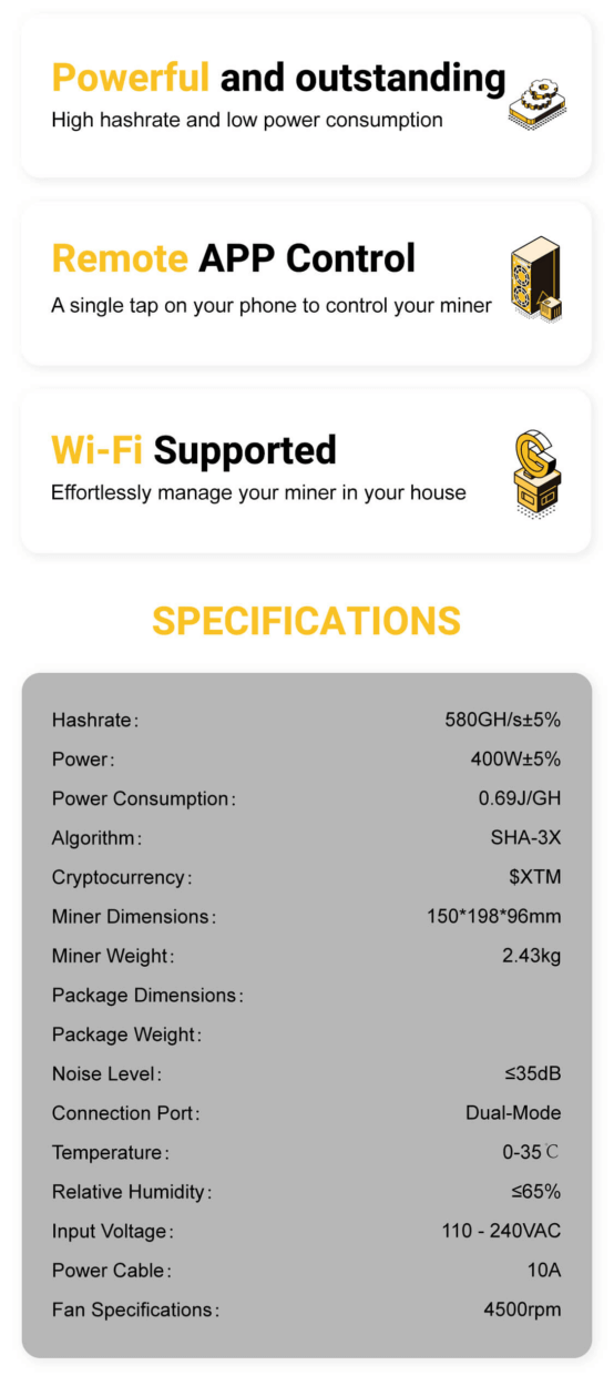 Boasting a maximum hashrate of 580Gh/s and power consumption of 400W, this high-hashrate low-power miner achieves an industry-leading energy efficiency ratio of 0.69J/GH, slashing your low electricity cost while maximizing mining profits. Designed for optimal performance and stability, the XTM mining device fits perfectly into home & small-scale applications, catering to individual home miners, small-scale mining enthusiasts and crypto hobbyists alike. Equipped with Hong Kong/Singapore plug and global voltage support, it supports Ethernet/Wi-Fi dual-mode for easy setup miner operation, and comes packed with ≤35dB low-noise operation, remote APP control like quiet mining device design for a seamless user experience.